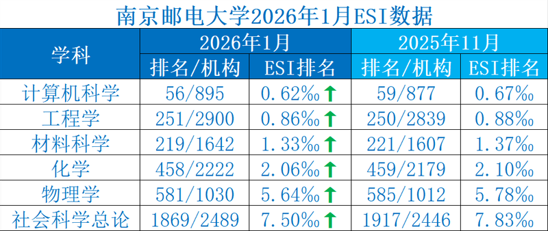 1月8日,科睿唯安发布ESI(基本科学指标数据库,Essential Science Indicators)最新统计数据(数据范围:2015.1-2025.10)。2026年1月,我校ESI全球排名877位,较上一期提升6位;我校参与发表的顶尖论文数量为387篇。我校现有计算机科学、工程学、材料科学、化学、物理学、社会科学总论等6个学科入选ESI全球前1%,其中“计算机科学”“工程学”进入ESI全球排名前1‰。